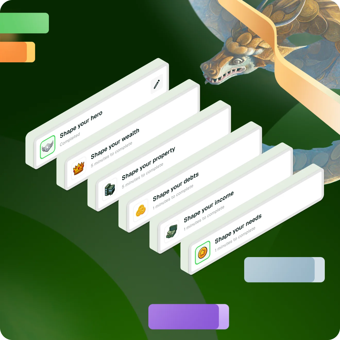 Turn financial chores into bite-sized quests. Each quest nudges a real-world metric: savings, debt, insurance and more.